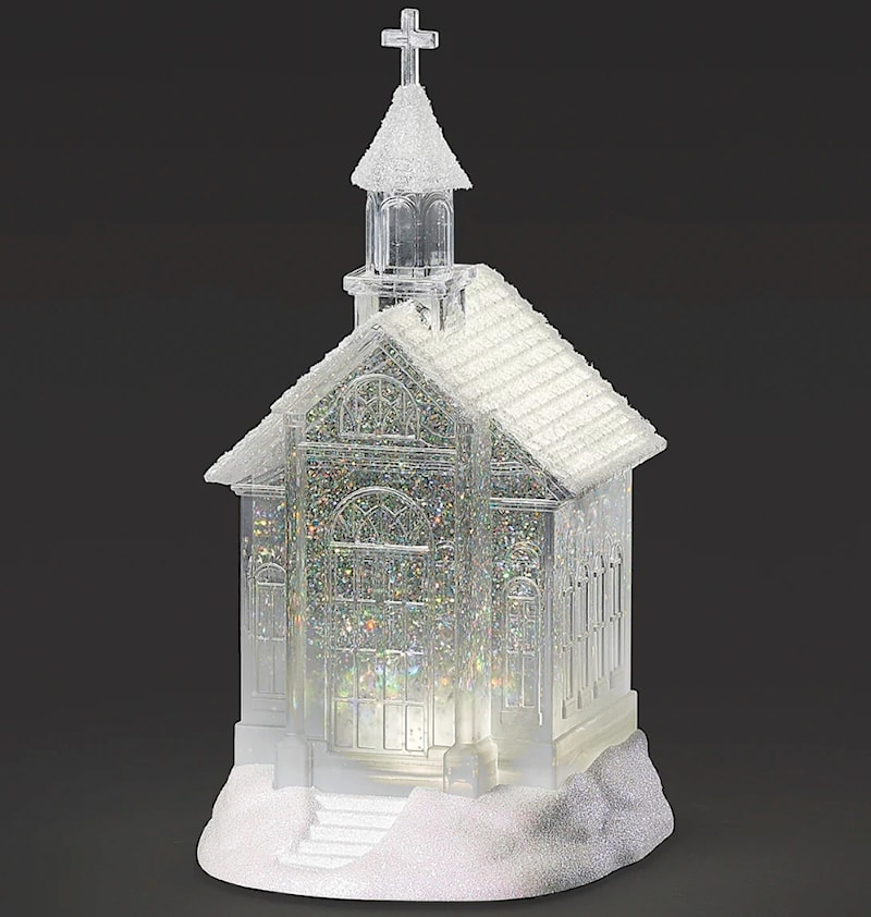 Elegant and luminous, this clear acrylic church sparkles with swirling glitter and a shimmering glittered roof. A beautiful addition to your winter village or holiday display.
