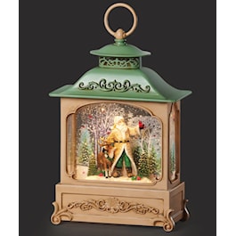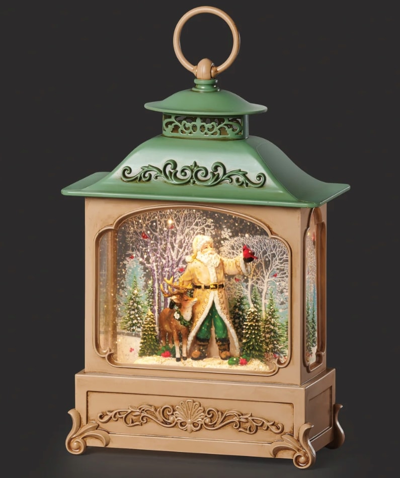 Celebrate the season with this festive lighted swirl lantern. Santa stands with a reindeer beneath a charming green roof, as glitter swirls in the glow of warm light. A classic and heartwarming holiday display, it’s perfect for mantels, shelves, or entryway décor and makes a timeless addition to your Christmas collection.