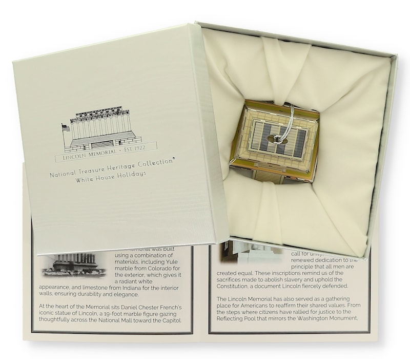 Collect this amazing ornament celebrating the Lincoln Memorial. The Lincoln Memorial, constructed between 1914 and 1922, was built to honor President Abraham Lincoln, who preserved the Union and abolished slavery, embodying values of unity and individual liberty. It stands as a symbol of national strength and reverence for a leader who upheld the Constitution while confronting division and moral challenges. Read the enclosed brochure to discover more about the heritage of this incredible monument.