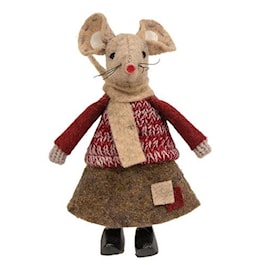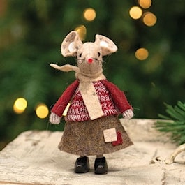The Little Girl Patches Mouse is a petite plush mouse made with tan fabric. The mouse wears a red knit sweater, a taupe patched skirt, and a tan scarf, and includes stitched facial details. The mouse’s legs are made of wood and have two black clog shoes for a standing display. This mouse is a cute and simple addition to Winter décor and displays well standing on a shelf or tabletop.