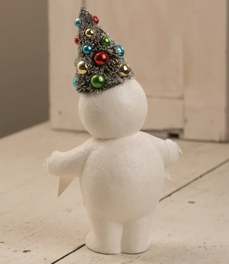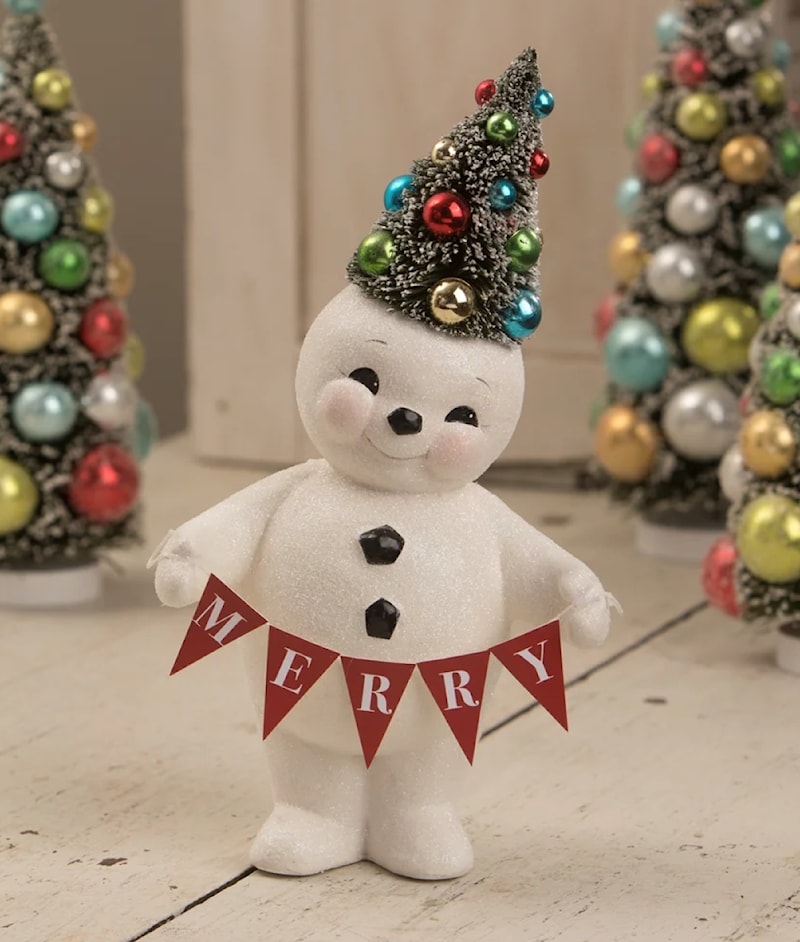 Bring home the best of retro inspired holiday décor with this adorably chubby snowman by Bethany Lowe Designs. With colorful bottle brush tree on head and MERRY banner in hand this snowman is sure to delight!