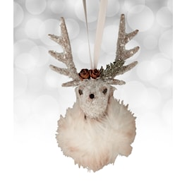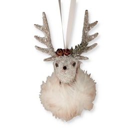 Step into a world of elegance with our enchanting dove-colored stag! Prepare to be captivated by its presence, shimmering with an exquisite coat of light-reflecting glass glitter. Adorned with a fox faux-fur scarf and a headdress of tiny pine cones, both delicately crafted to perfection, this stag exudes sophistication. The rhinestone-studded nose is a dazzling detail that adds a touch of sparkle to this already magnificent creation. Hang this masterpiece with the included satin ribbon hanger and watch as it becomes the centerpiece of your holiday decor.