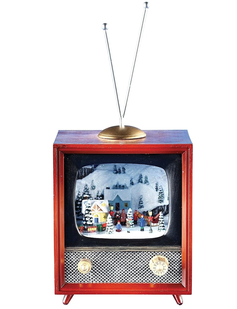Decorate this holiday season with this unique TV village decor! It plays Jingle Bells, We Wish You A Merry Christmas, Silent Night, Deck The Halls, Joy To The World, The First Noel, Hark! The Harold Angels Sing, and Oh Christmas Tree.