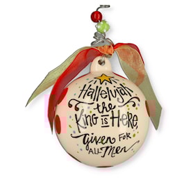 "Hallelujah the King is Born given for all men" is written on the back of this ornament. 4.33 inches in diameter Metal hanger with ribbon.