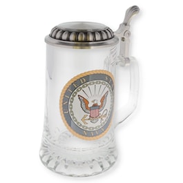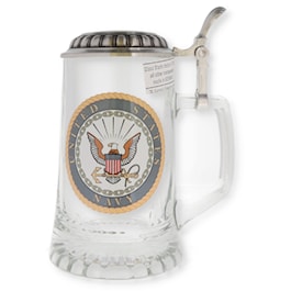 A United States Navy emblem decorates the tapered, smooth, sturdy glass body. A starburst light-reflecting pattern decorates the bottom and the smooth heavy gauge lid is removable! Perfect for personalizing on the body or the lid. The stein has a special threaded hinge pin. The lid is easily removed and reattached by simply tightening and loosening the hinge pin with an allen wrench.