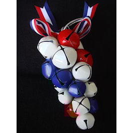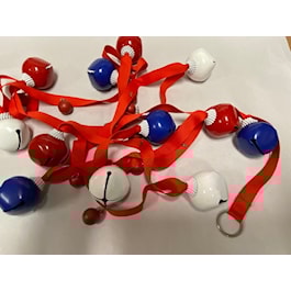 Celebrate success with this Red, white and blue 6' garland. 5 Red, bells, 5 blue bells, and 5 white bells. Can also be used as a decoration. R,W & B ribbon tied at the top. Made in China. Not a toy.