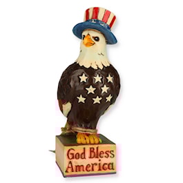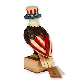 Wearing an Uncle Sam hat, this proud bald eagle puffs its chest with reverence and patriotism. Boasting plumage of stars and stripes, he perches on a stage blessing America. Celebrate your pride for country with this spectacular piece by Jim Shore. Jim Shore's unmistakable style evokes a sense of nostalgia with traditional themes, quilt patterns and design motifs inspired by the American and European.