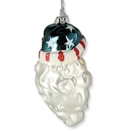 This glass Santa head ornament is the perfect addition to your patriotic themed holiday décor. It features a glittered Santa head with a glittered red, white and blue stars and stripes themed Santa hat.