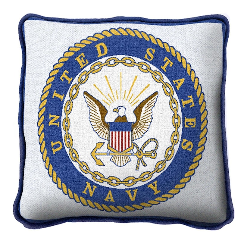United States Navy Pillow. The naval branch of the military is honored on this pillow. Specifications: This Pillow is 17 inches wide by 17 inches tall, and is Woven from 100% Cotton providing rich color, texture and definition.· Jacquard woven style provides true depth, texture and richness.· Carefully woven and sewn with care and attention to detail.