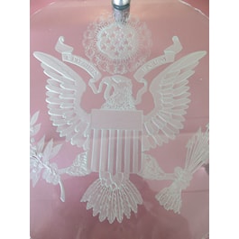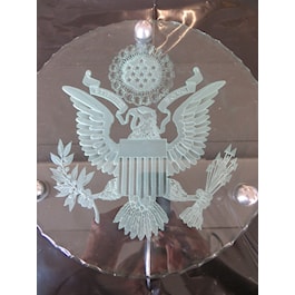Glass Tray with engraved image of the Great Seal of the United States. Beveled edge and metal pegs to give it pedestal effect. Could use for cheese and fruit, cookies or bars. Almost too beautiful to cover the design.