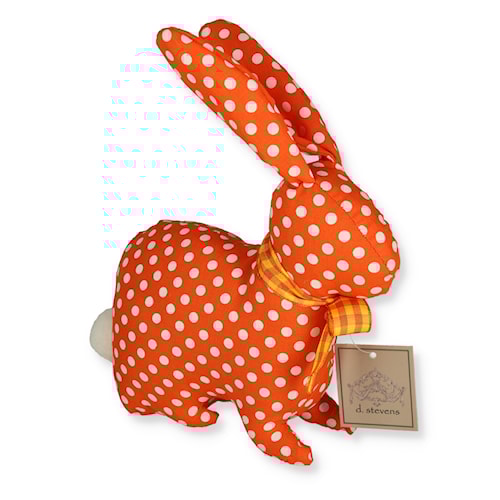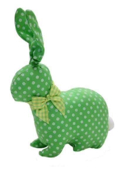 Green linen with white polka dot linen sitting Rabbit. Contrasting Bow tie and white fluffy tail. 6 inches long and 8 inches tall with ears.