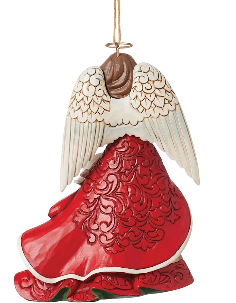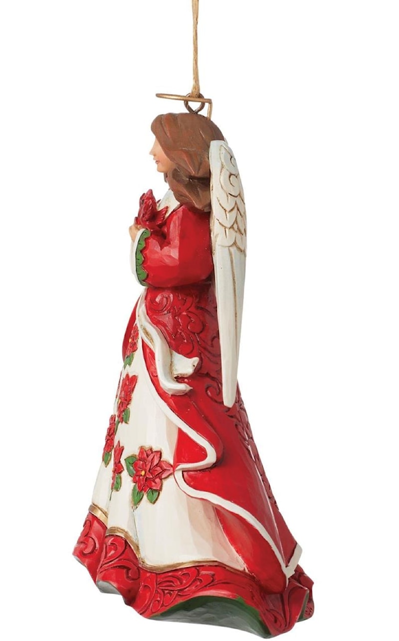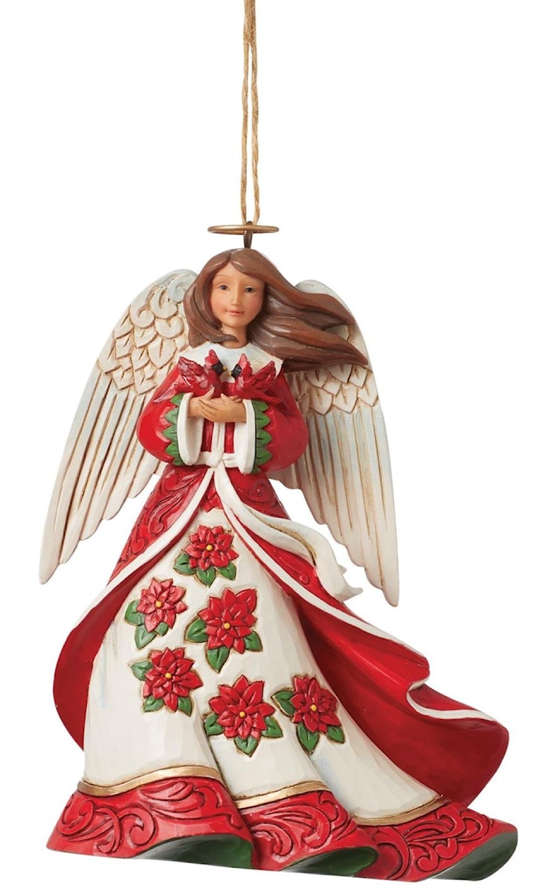 In a radiant red dress this angel ornament holds two cardinals in her hands with a smile. Gown billowing, pleasant poinsettia blossoms decorate her dress with hope and beauty. With enchanting wings and rosemaling details, this Jim Shore piece brings peace.