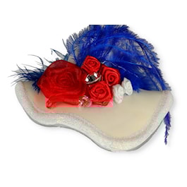 Adorn your Christmas tree with this gorgeous scalloped vintage glass ornament ladies' hat. This ornament is hand-painted and designed in Poland and is decorated with red and white flowers, crystals, and blue feathers.
