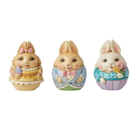 This charming set of three character eggs are packaged thematically in a carton. Beautifully hand-painted and crafted with intricate styling and attention to detail, these Jim Shore creations are a spring delight. Each egg is a unique rabbit friend.