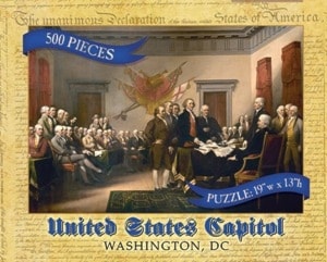 Signing of the Declaration of Independence Puzzle. 500 piece puzzle will give hours of fun that when fully assembled is a 19" x 13" reproduction of the John Trumbull Rotunda painting. "Signing of the Declaration of Independence in Congress at Philadelphia, July 4, 1776."