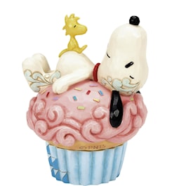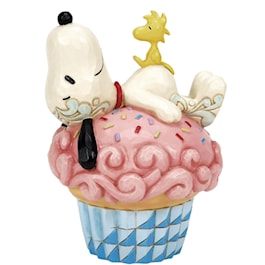 In Jim Shore's charming design, Snoopy takes a cozy nap atop a large, sprinkled pink cupcake, complete with intricate rosemaling details and tempting icing. Adding to the sweetness, Woodstock joins the slumber party on top of Snoopy.