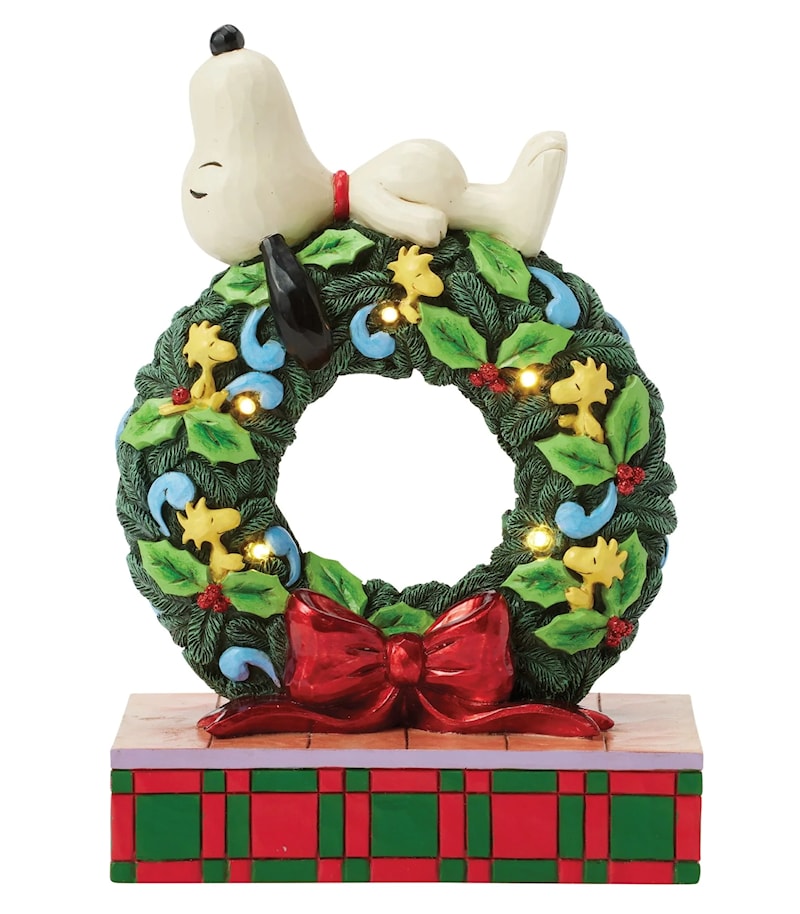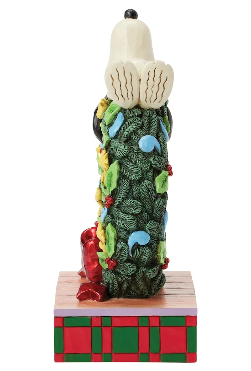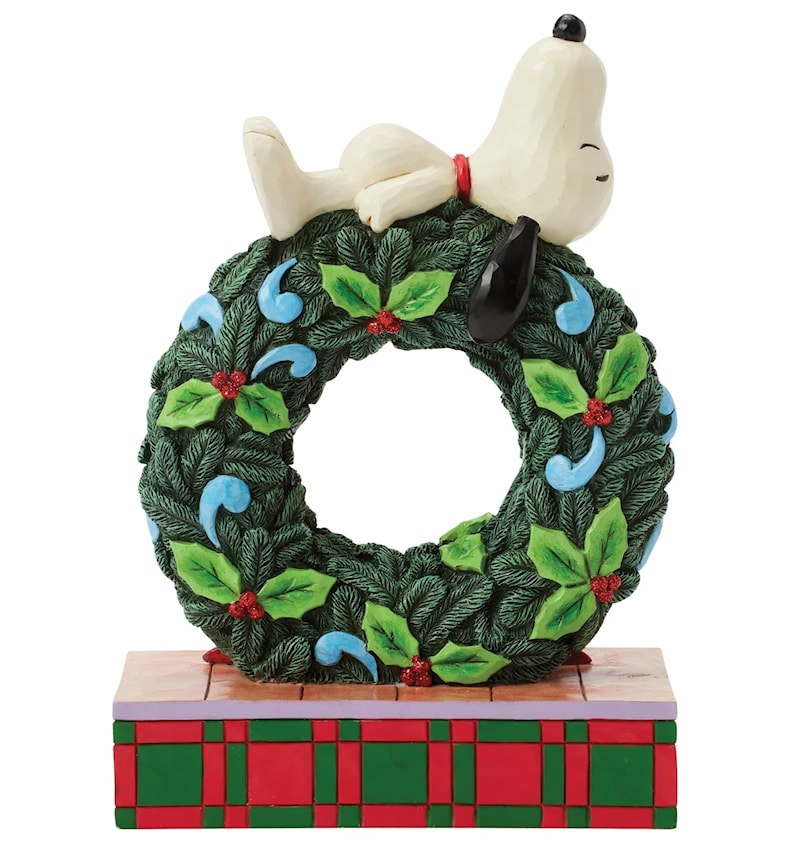Add a touch of festive charm to your holiday decor with this delightful Jim Shore design of Snoopy peacefully snoozing atop a lush holiday wreath. The wreath, lovingly adorned by Woodstocks, adds a whimsical touch to your holiday home decor.