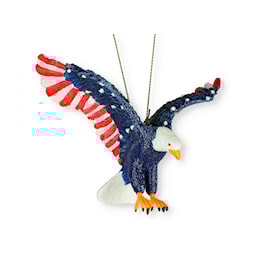 This stars and stripes eagle ornament is a fun, unique way to add to your holiday décor! This swooping bald eagle ornament features many delicate details like intricate wings, sharply painted eyes and yellow clawed feet with an American flag design decorating the eagle's wings. This ornament is perfect for showing your patriotism!