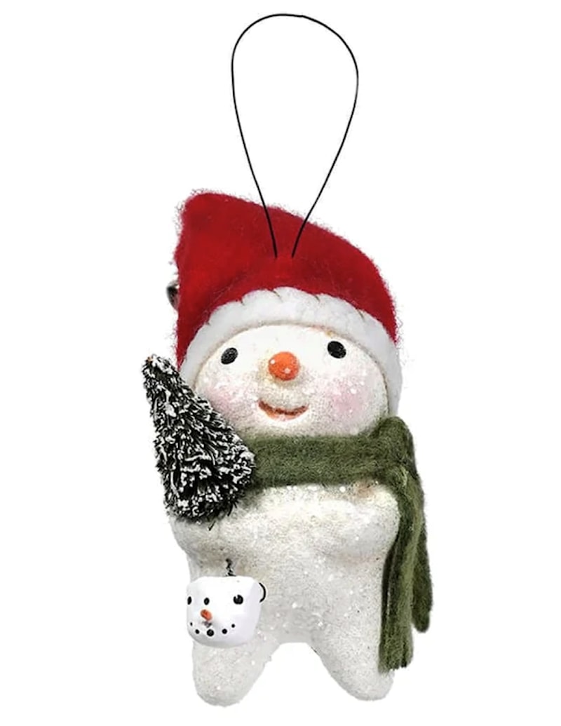But there's more to discover. Clutched in its snow-made arms is a mini bottle brush Christmas tree, adding a touch of evergreen elegance to the scene. And beneath that tree? A mini snowman head, adding a playful twist to your holiday decor.