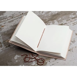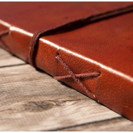 • Material: Sustainable salvaged leather cover material with a string tie closure.