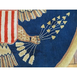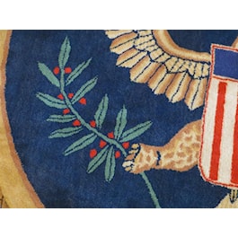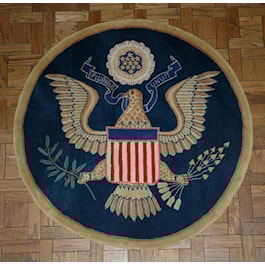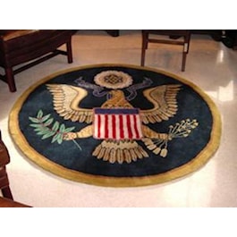 Make presidential decisions in your home or office decorated with this distinguished five-foot, round, plush rug that bears the emblem of The Great Seal of the United States. The navy-blue background is framed with a tan border.