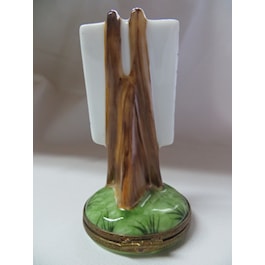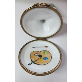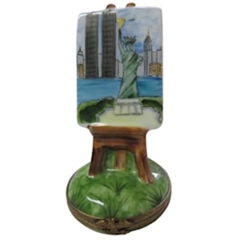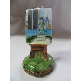 Remembering September 11, 2001- those helpless who died and those who sacrificed  their lives to save others in need.   Lest we never forget this day of Infamy.  Unknown artist captured the Twin Towers in New York and left his painting on his easel for this Limoges box. The box also includes the Statue of Liberty and the New York skyline before September 11 2001. Artist left his paint brush and pallet inside the 3 3/4" Limoges France box
