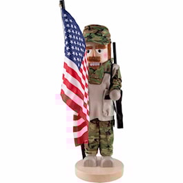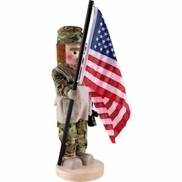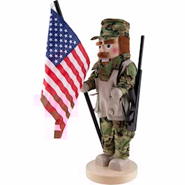 He wears the typical camouflage uniform with a beige colored vest and matching shoes. To present the country he fights for, our nutcracker holds a big USA flag in his hand.