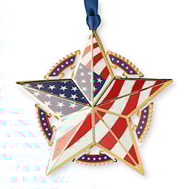Celebrate the red, white and blue with this new USA Star with flag Ornament. This beautiful ornament is finished in 24 karat gold over brass. It is a perfect ornament by itself or when used to complement other patriotic ornaments in your collection! This will make a wonderful gift for the patriotic person in your life - gift it with pride! 100% handcrafted in America. Gift Boxed.