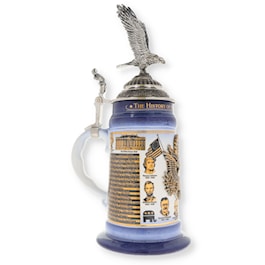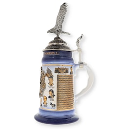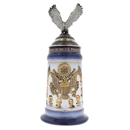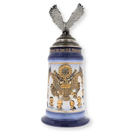 Comes with certificate of authenticity. This is the original, high quality, numbered stein from Germany. Limited edition one of 5000 made.This stein chronicles the occupants of the office of President of the United States of America. The body of the stein is blue glazed, high quality stoneware decorated with a gold wrap around design. Along the top border are the words "The History of the U.S. Presidents." The left side of the gold design features the first half of a timeline chronicling the progression of U.S. Presidents beginning in 1789 with George Washington and ending in 1892 with Grover Cleveland.