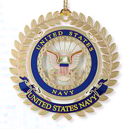 Celebrating our military and those who serve with this patriotic, solid brass, 24kt gold plated ornament.