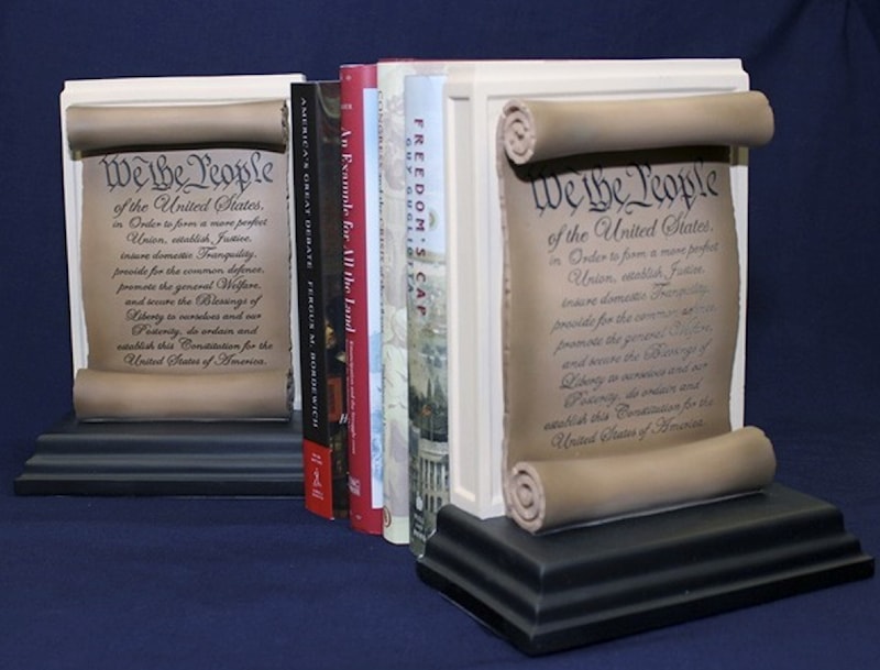 This collectible set of molded resin bookends is a welcome addition to any library setting. Beautifully crafted with a scroll like front that incorporates the preamble of the Constitution in this classic design. Gift boxed with provenance for easy gift giving.