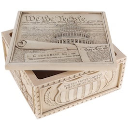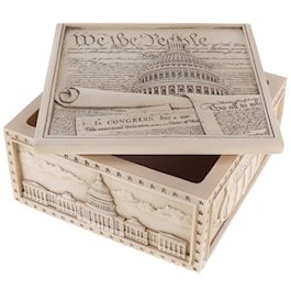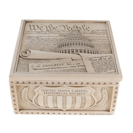 Architectural and patriotic relief designs adorn this beautiful antiqued ivory resin box that can be used for a multitude of purposes.