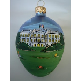 Hand-painted, mouth-blown glass ornament. White House Easter Egg Roll. Made in Poland. 3 1/2” tall 2 1/2” wide. Blue egg with painted image. Individually gift boxed.