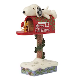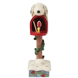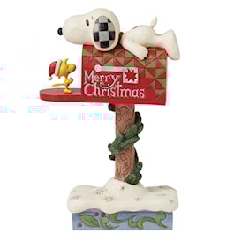 pecial delivery! This holiday mailbox is wrapped in garland with rosemale and patchwork patterning. Resting on a stage of mistletoe and snowflakes, this Jim Shore Peanuts design shares a scene of Snoopy and Woodstock sending a letter to Santa.