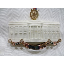 The ornament features an intricately detailed reproduction of the North Portico on one side and The South Portico on the other side. It is crafted with the same sandstone used to construct the walls of the White House more than 200 years ago from a quarry in Virginia. The ornament is enhanced with 24 kt. gold finished brass accents.