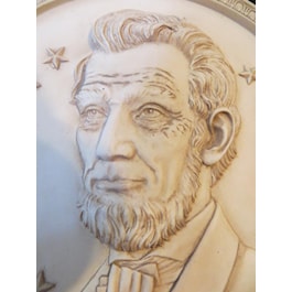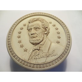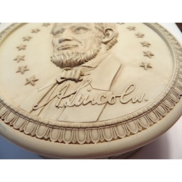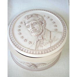 Abraham Lincoln's portrait is emblazoned on a round, decorative poly-resin box. Lid removes to a 3 3/4 inch opening. The overall box measures 4 1/2 inches in diameter and 2 inches high. Hand applied antique finish.