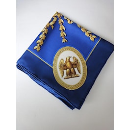 The central image on this silk scarf is the North Front of the White House as it is seen from Pennsylvania Ave. The view is surrounded by reproductions of the Seal of the President of the US that hangs above the entrance to the Blue Room. Also featured are details of White House architectural motifs including the sumptuous stone carvings around the North Door. The distinctive bald eagles carved in the pedestals of the mahagony console tables made for the State Dining Room in 1903 are pictured in each corner of the scarf.100% silk, hand rolled hem. Gift Box presentation. 33" square. Made in France.