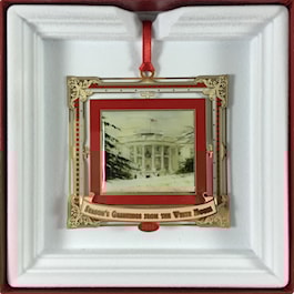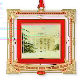 The ornament was beautifully hand crafted in the USA, using a polished brass base with a 24 karat finish.The design was hand screen printed with a dapped forward image, double framed with exquisite color. The ornament is packaged in a red gift box with gold hot stamping of the White House and the words Season's Greetings from the White House. This ornament is not a part of the White House Historical Association Collection. A provenance card is included.